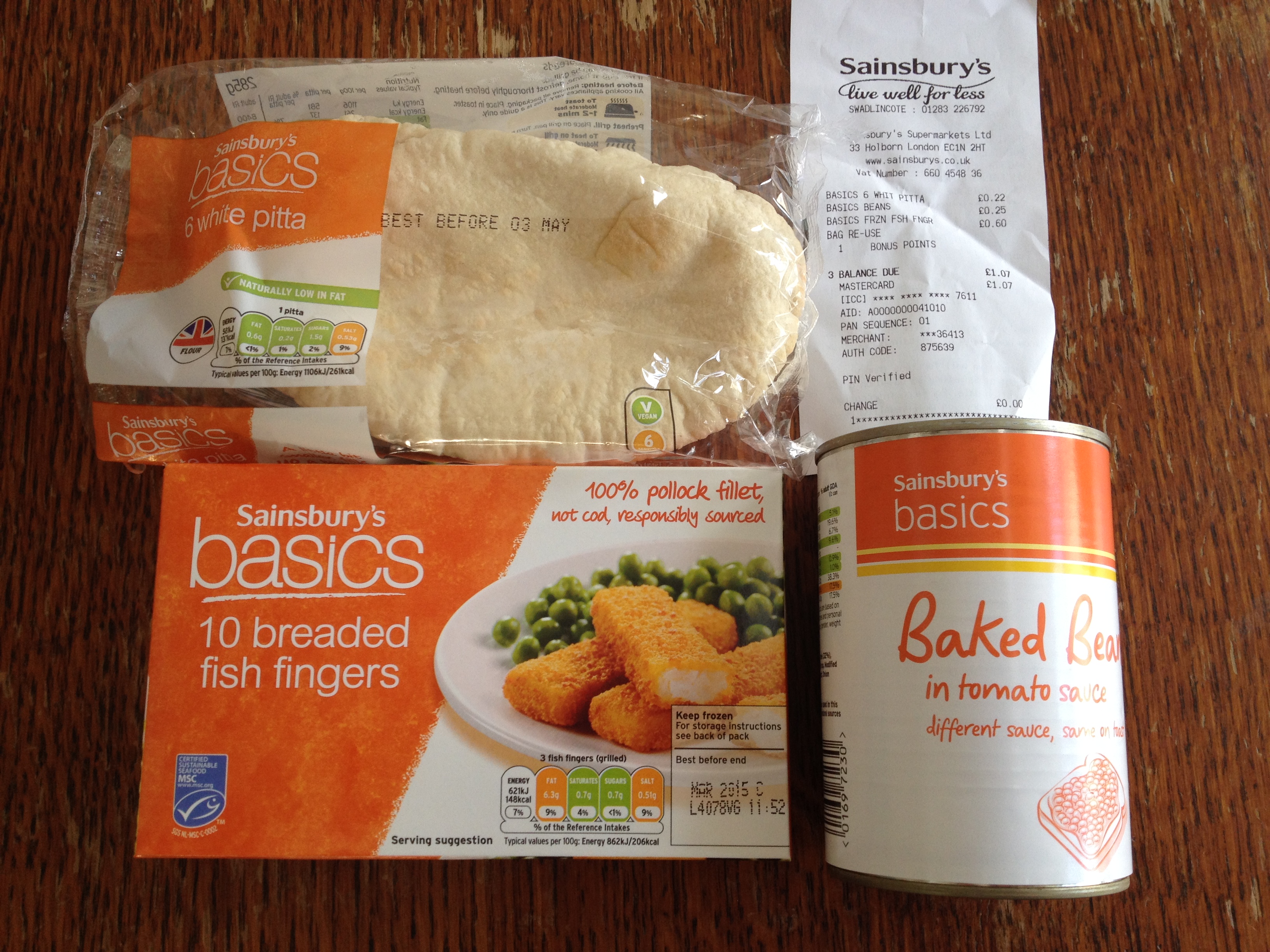 I think what I’ve found this week is that it is certainly possible to eat “enough” on £1 per day, but it is very difficult to get a balanced diet with the recommended 7 portions of fruit or vegetables per day, and to get protein into the diet without associated salt e.g. from baked beans. Meat has been limited to the tin of Irish Stew and the tin of Meatballs, whilst the only fish I have had was today’s fish fingers. Next week I shall do a post-challenge analysis blog looking at the nutritional content of what I ate, to see if really was a “bad” way of eating. What I can say is that the negative press Sainsbury’s get as an “expensive” retailer just is not true if you’re prepared to use the Basics range. There has been nothing this week that I wouldn’t eat again, and has all been truly good value.
